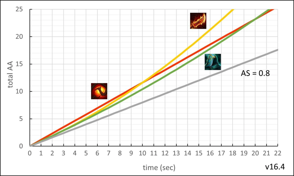 攻撃速度(AS)アイテムの代表格である「グインソー・レイジブレード」と「レッドバフ」、「クイックシルバー」の強さを、戦闘時間ごとの攻撃回数で比較検証。