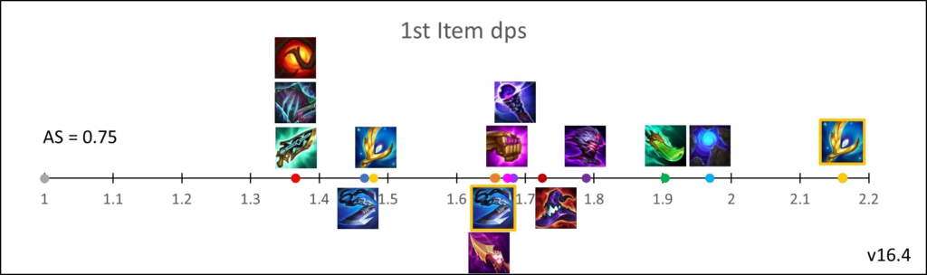 スタック系アイテムは最大スタック時、時間経過で強くなるアイテムは18秒時点(クイックシルバーの効果が切れるタイミング)での数値を黄枠として比較。