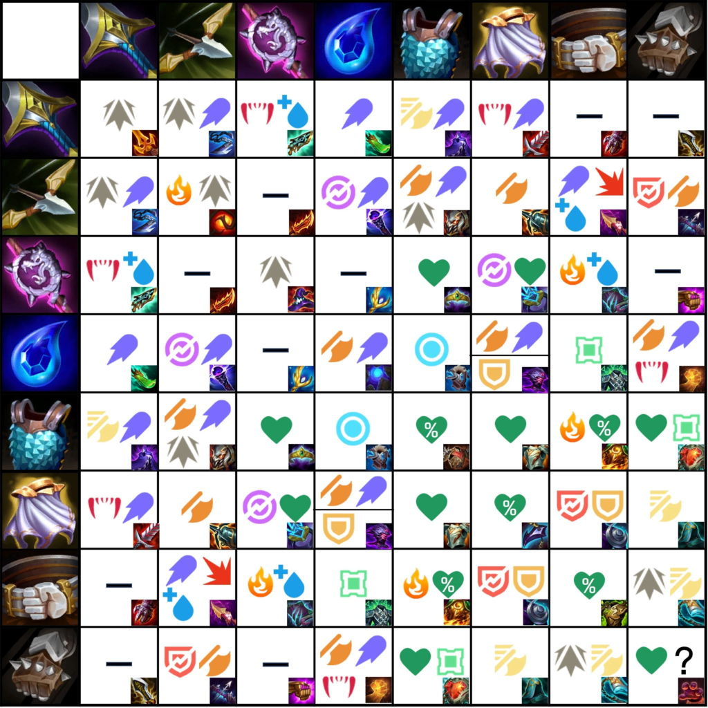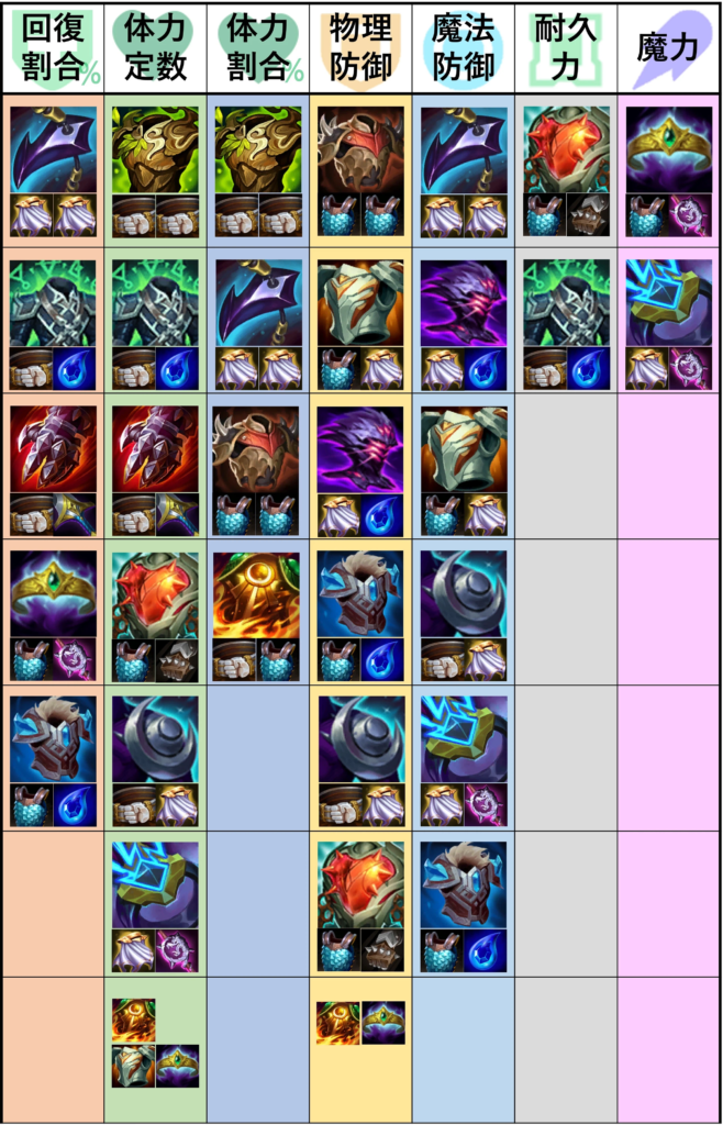 - クラーケン: 攻撃力偏重のステータスを持つため、攻撃速度(AS)増加と極めて相性が良いです。ASが低いと序盤の弱さが目立ちます。