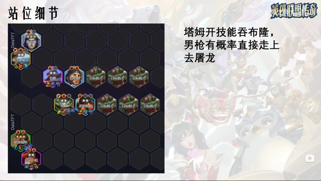 • 対T-Hex: タム・ケンチを相手のメインタンク(ブラウム等)の正面に置きます。タム・ケンチがスキルで敵を飲み込んで押し退けた隙に、グレイブスが横を通り抜けてT-Hexを直接攻撃(屠龍)する配置が強力です。