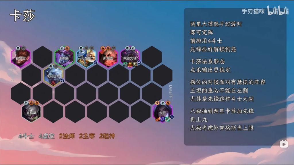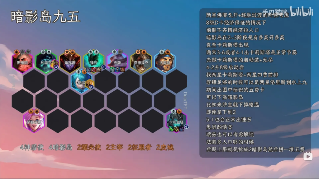 • 進行: ★2ヴィエゴで連勝している場合に検討。レベル8でリロールするための経済的な余裕が見込めるなら序盤から積極的にレベルを上げる。シャドウアイルはステージ2から3の間、出せる限り高いティアで発動させる。(ペース的にはカリスタは3-6か4-1で引くのが理想)