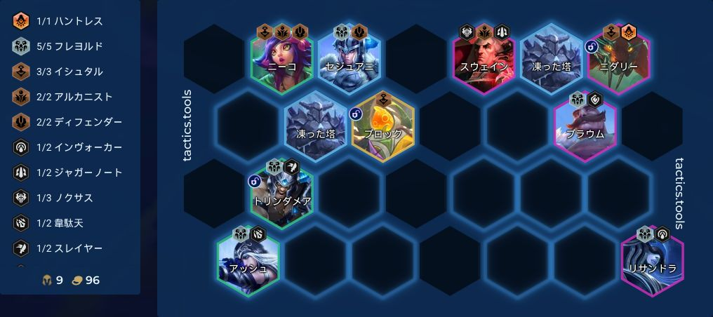 一般的なリロール構成は、★3を作った時点で伸び代が止まってしまい、終盤の「95構成(5コストだらけの盤面)」に捲られがちです。しかし、この構成はトリンダメアで中盤を圧倒し、その余裕を使ってイシュタルの「クエスト」をこなすことで、「ブロック」という終盤の回答を用意しています。