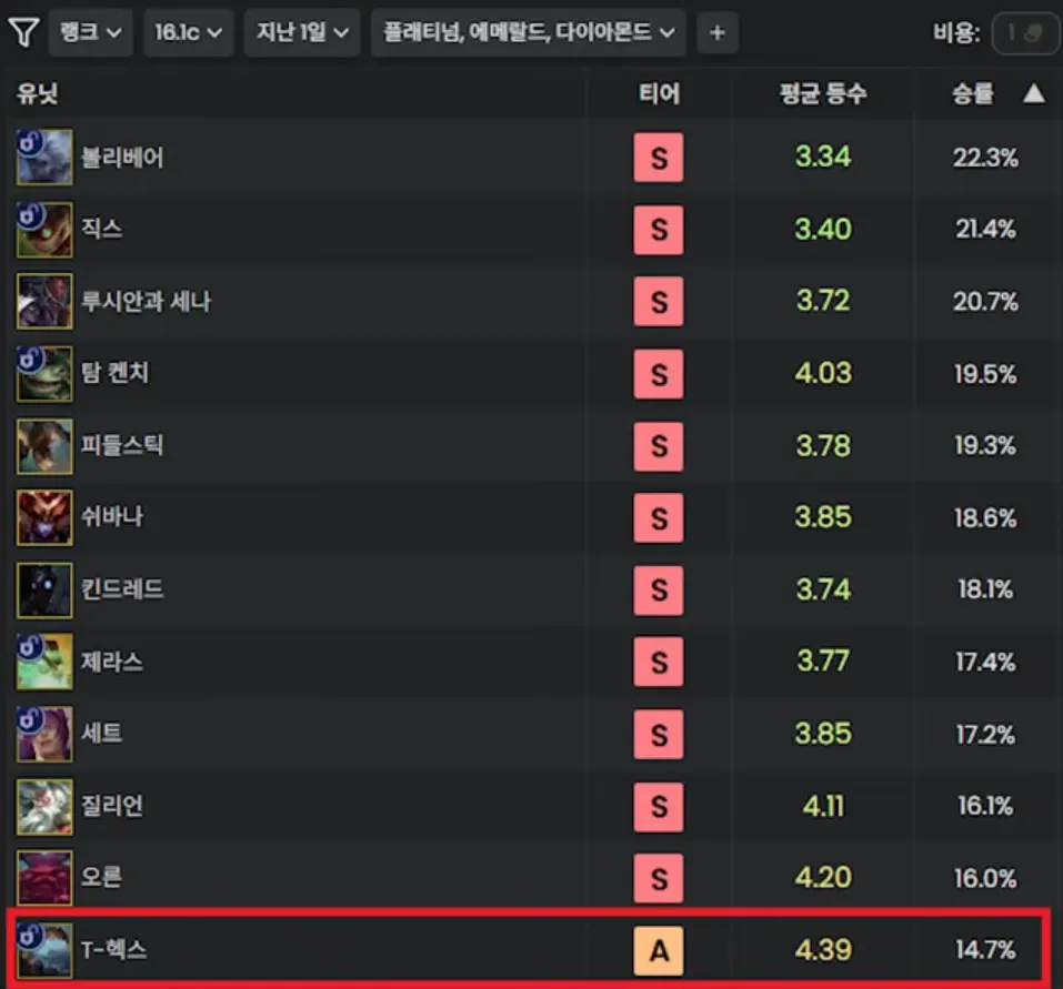 現在、チャレンジャー帯では「ジュラシックワールド」状態と言われるほど、T-Hex構成が圧倒的な勝率(22%)で1位を独占しています。一方で、低レート帯では勝率が振るわない傾向にありますが、これは「運用の細かな差」が原因です。トッププレイヤーたちが実践している「勝つための秘策」を詳しく解説します。