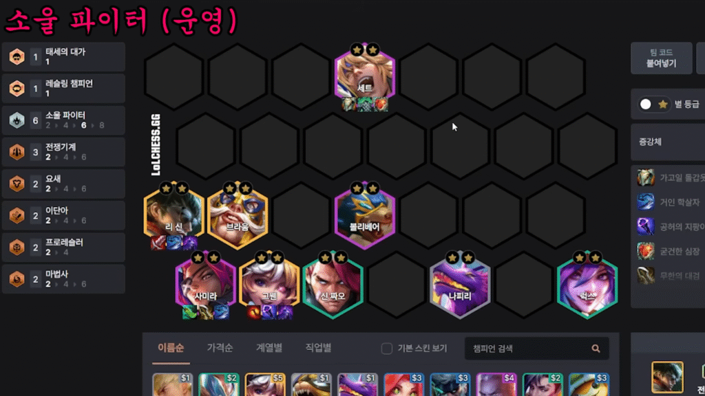 - ソウルファイターの紋章がない限りは、無理に高シナジーを狙うより、6ソウルファイターに強力な高コストチャンピオンを加える方が強い。