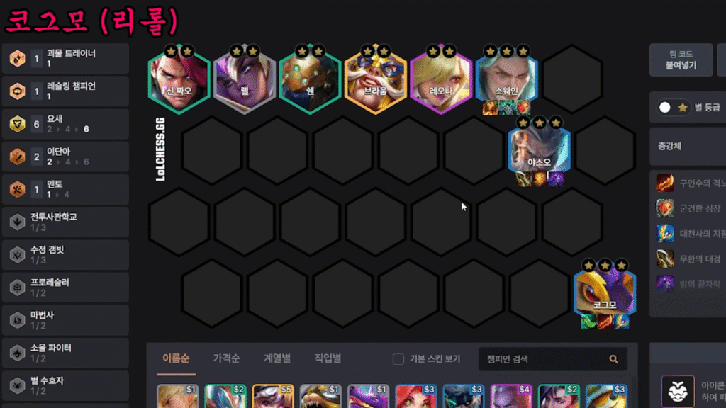 - 立ち回り:レベル7でスウェイン、ヤスオ、コグ=マウの3体の★3を目指す。