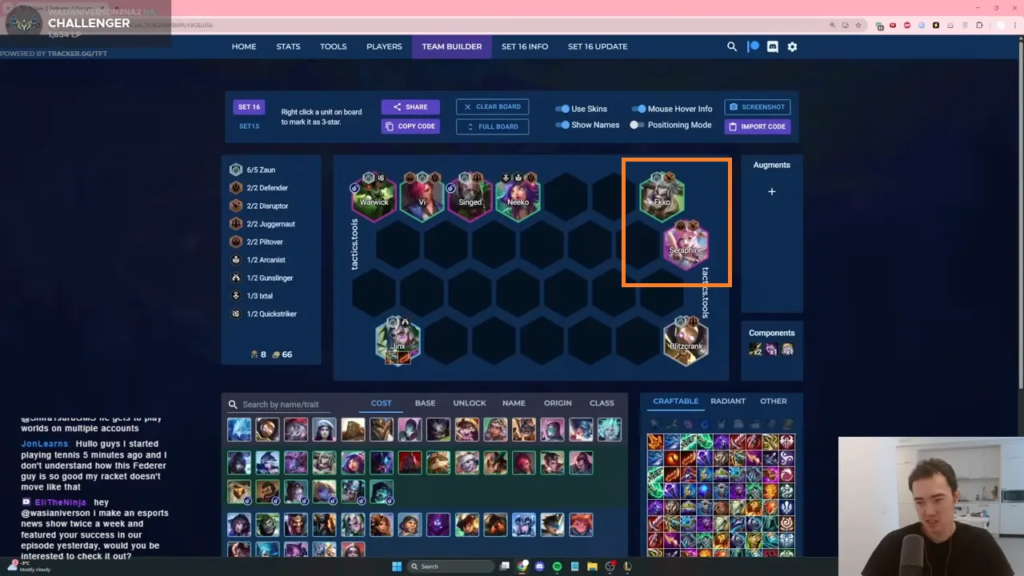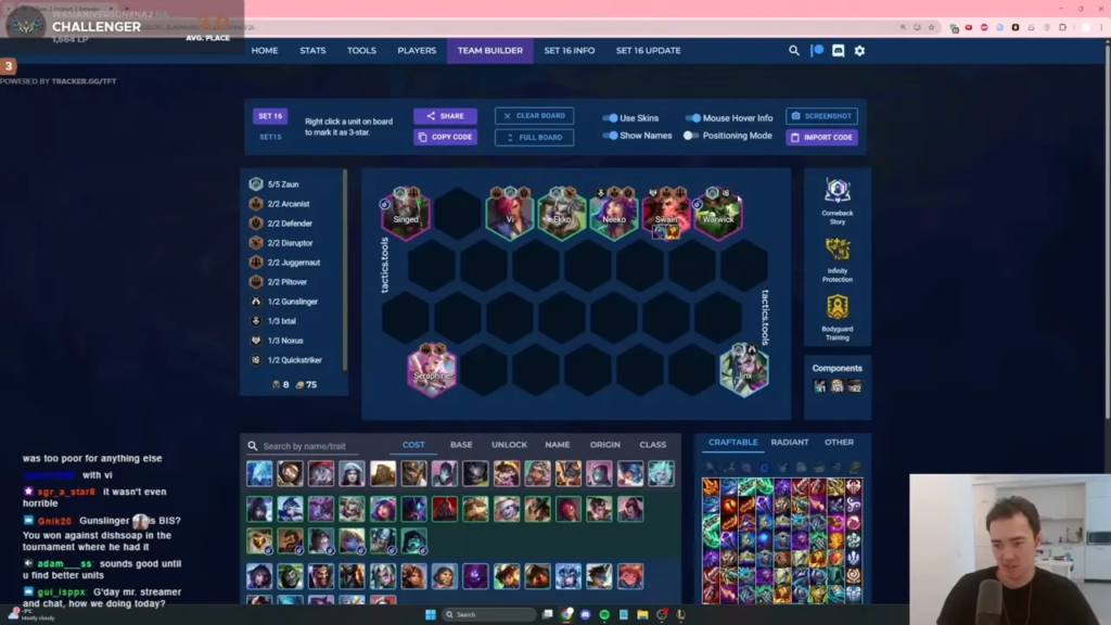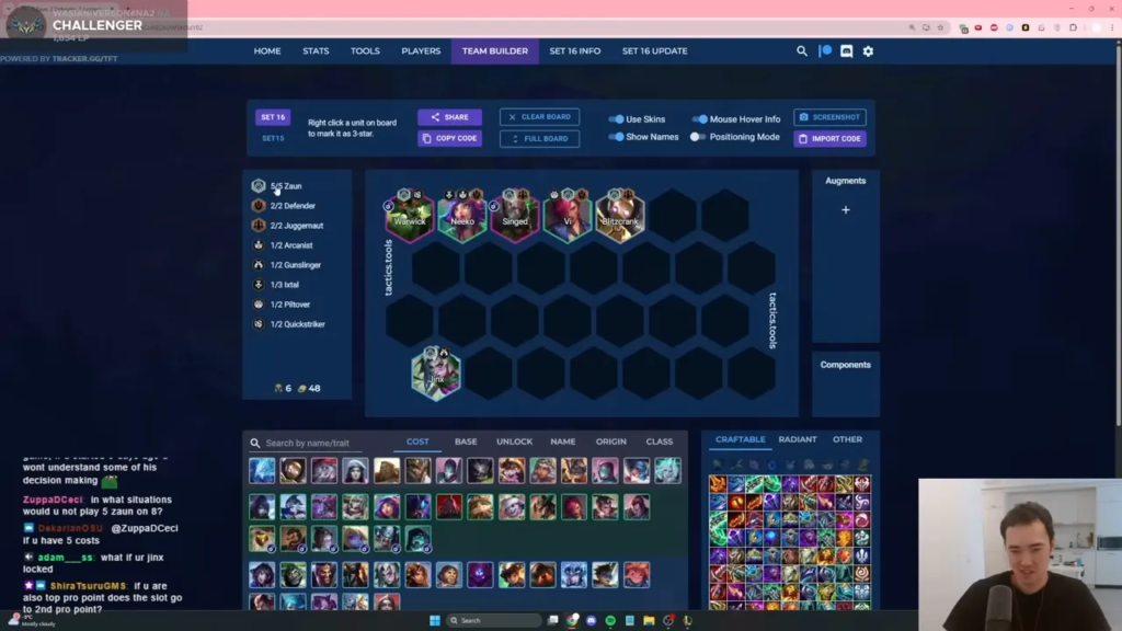 • 盤面の完成: ワーウィックのアンロック条件であるヴァイとジンクスにより、自然と「ゾウン(5)」の形になる。そこにブリッツクランクやニーコなどを加えて盤面を安定させる。
