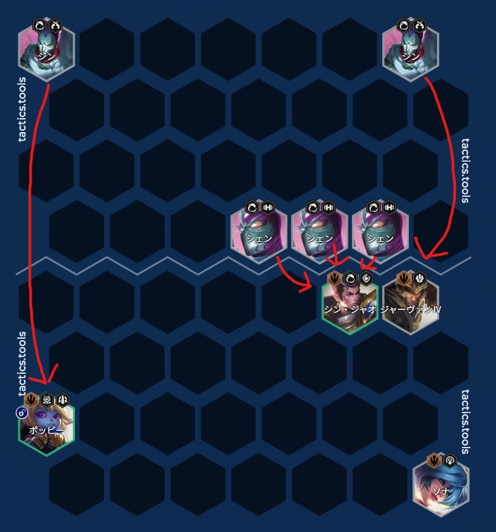 - 上記の配置をすることで敵タンクはシン・ジャオを、敵キャリーは味方タンク(ジャーヴァンⅣ、ポッピー)を攻撃します。それにより敵キャリーからシン・ジャオを守りつつ、タンク3体へ効率的にダメージを出すことができる。