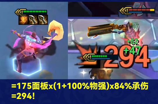 175(基礎値) × 200%(攻撃力) × 84%(軽減) = 294