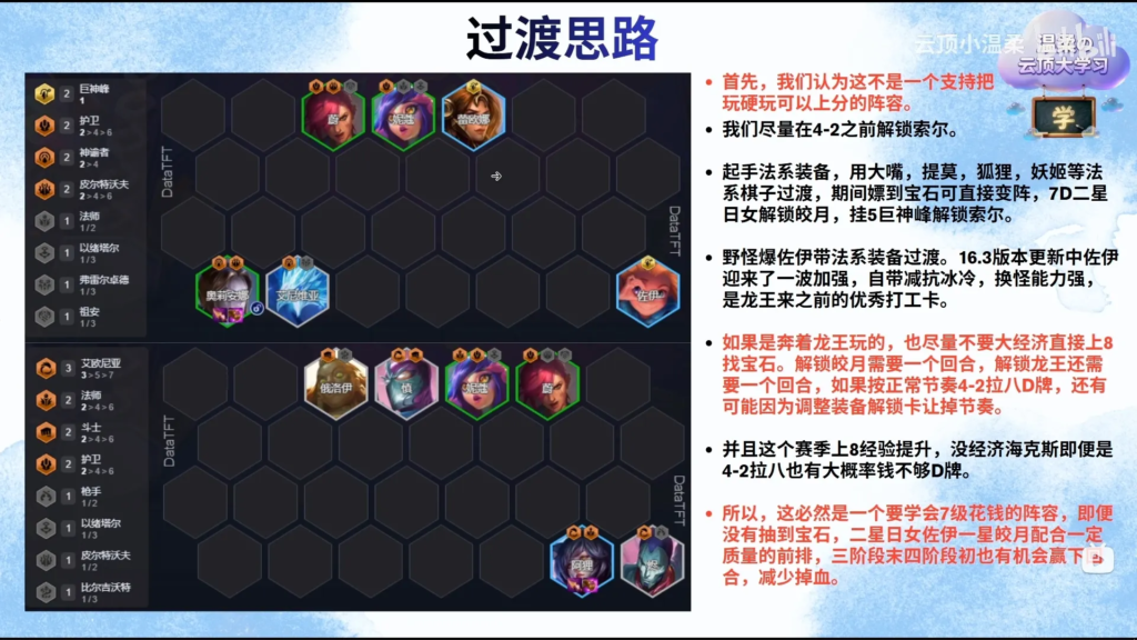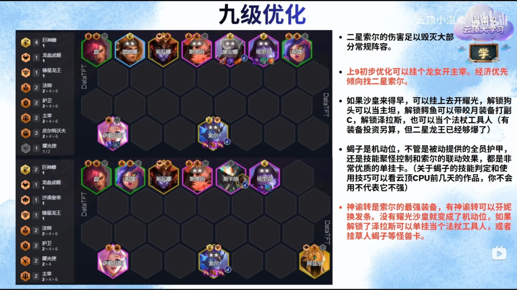 オレリオン・ソルは単体での性能が向上しているため、いつまでもシナジー(ターゴン)に執着する必要はありません。ステージ4以降は、低コストのターゴン駒を質の高い高コスト駒へ入れ替えていきます。