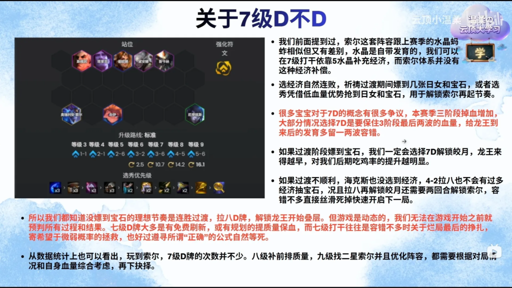 - 許容範囲の確保: レベル7リロールの目的は、ステージ3の終盤でHPを守り、オレリオン・ソルが来た後のスケーリング(成長)に必要な「あと1、2回負けても大丈夫な体力」を残すことにあります。